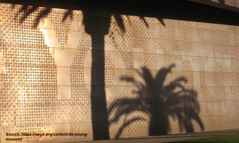 10/2/2023 - The sunlight dances across the unique texture of the exterior of deYoung Museum. Shadows cast by trees contrast the shimmering bronze.
